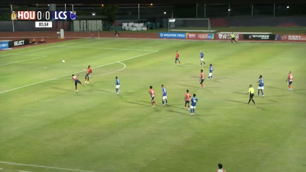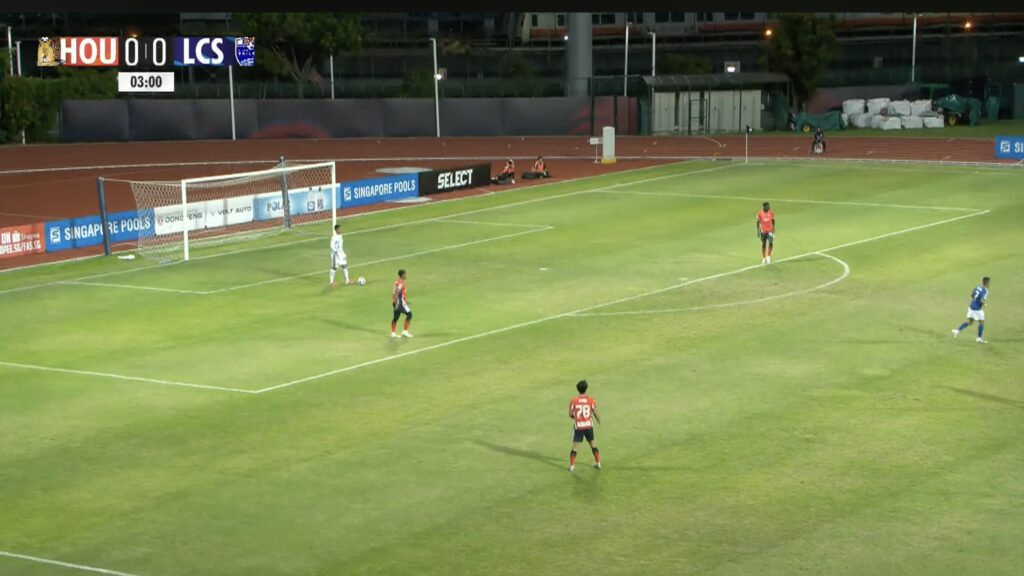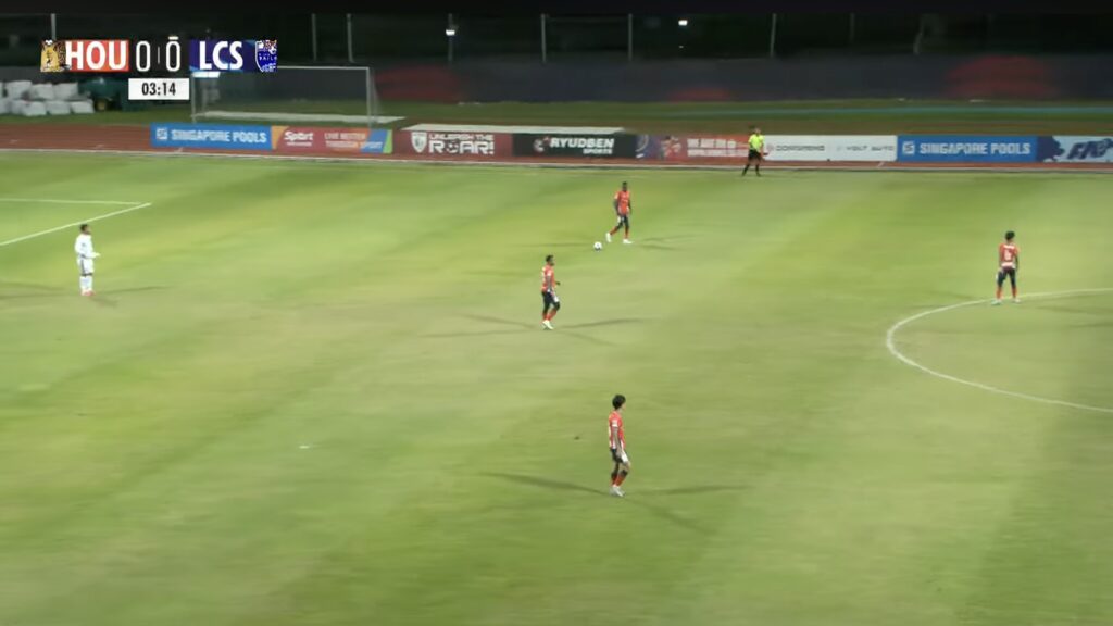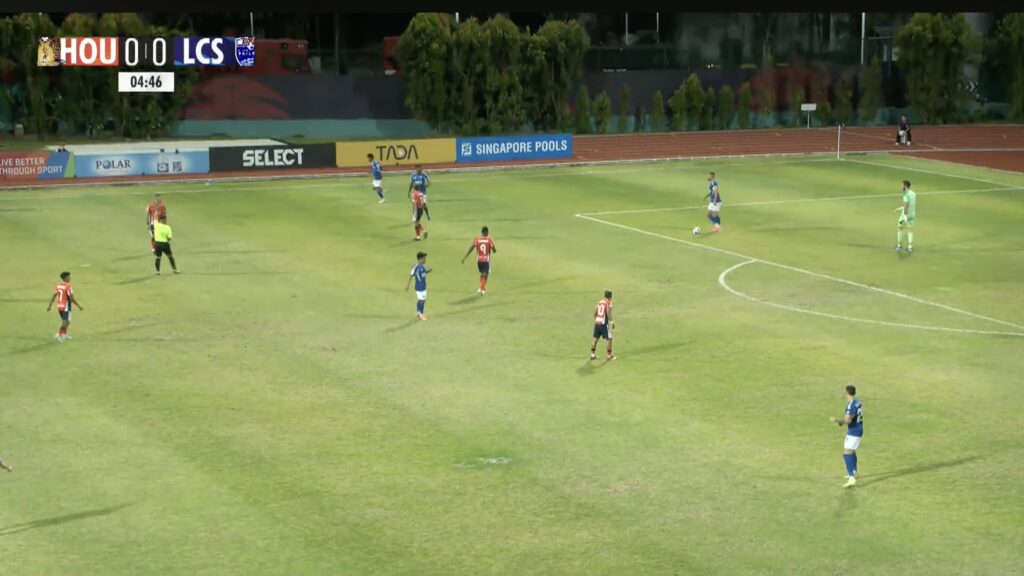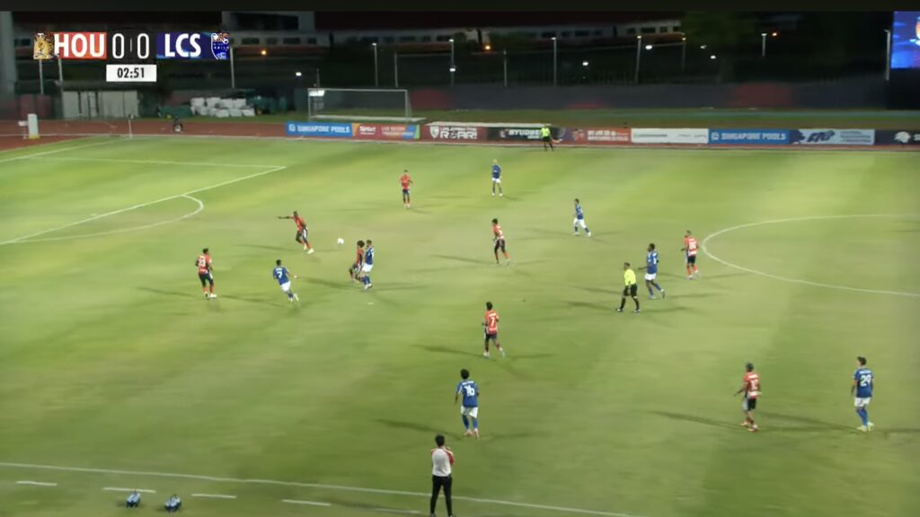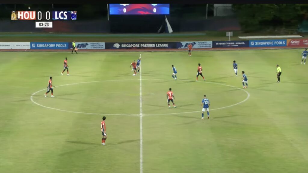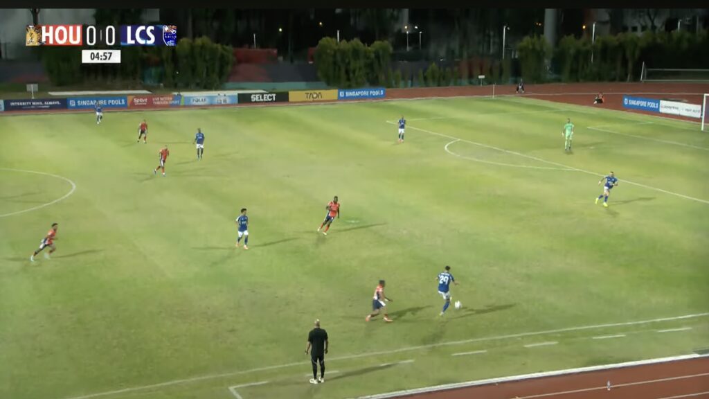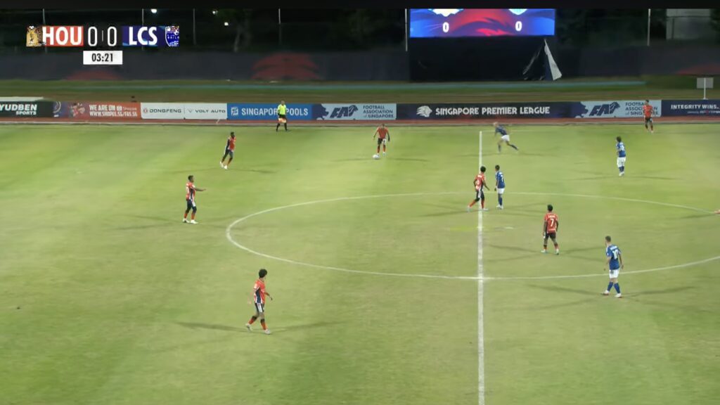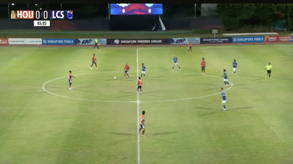 3′: LCS retreat back into their own half after a turnover to reset into a 5-4-1 defensive block.