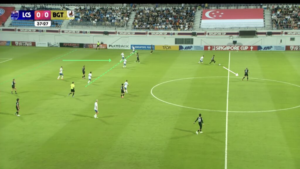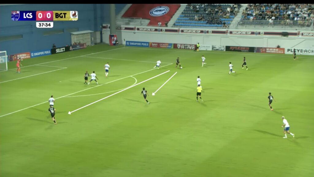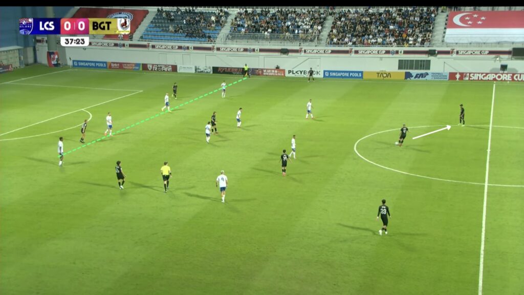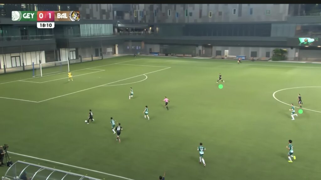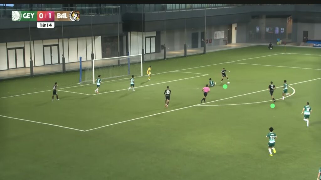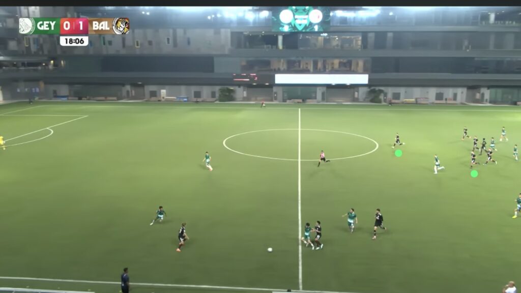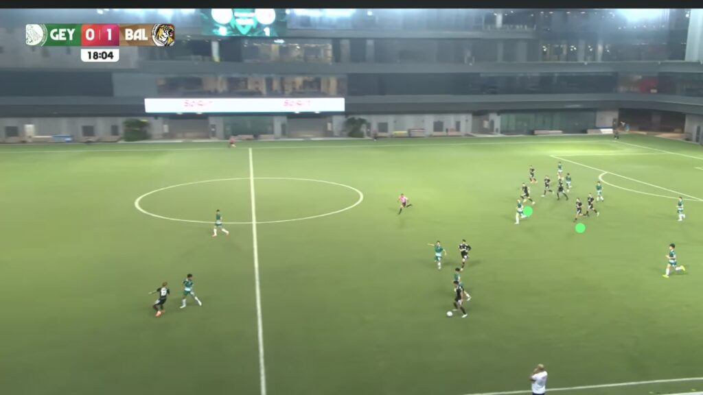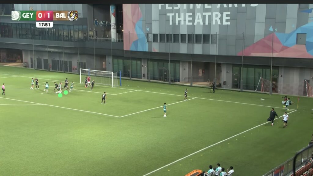 - 17′: HUWT No.27 Riddle Reneelyn Sison sends a long pass down the right wide area inside the LCSWT half for HUWT No.26 New Player to chase. LCSWT No.4 Umairah sprints to recover the ball first.
